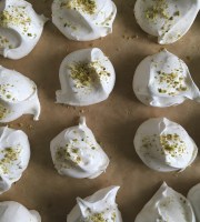 Preheat the oven to 200 degrees Fahrenheit. Sprinkle a small amount of the pistachio powder on each mound. Bake for two and a half hours. When finished baking, turn off the oven and wedge a wooden spoon between the door and the oven to slowly let the heat escape. Remove cookie sheet from oven after fifteen minutes and let meringues completely cool before eating.